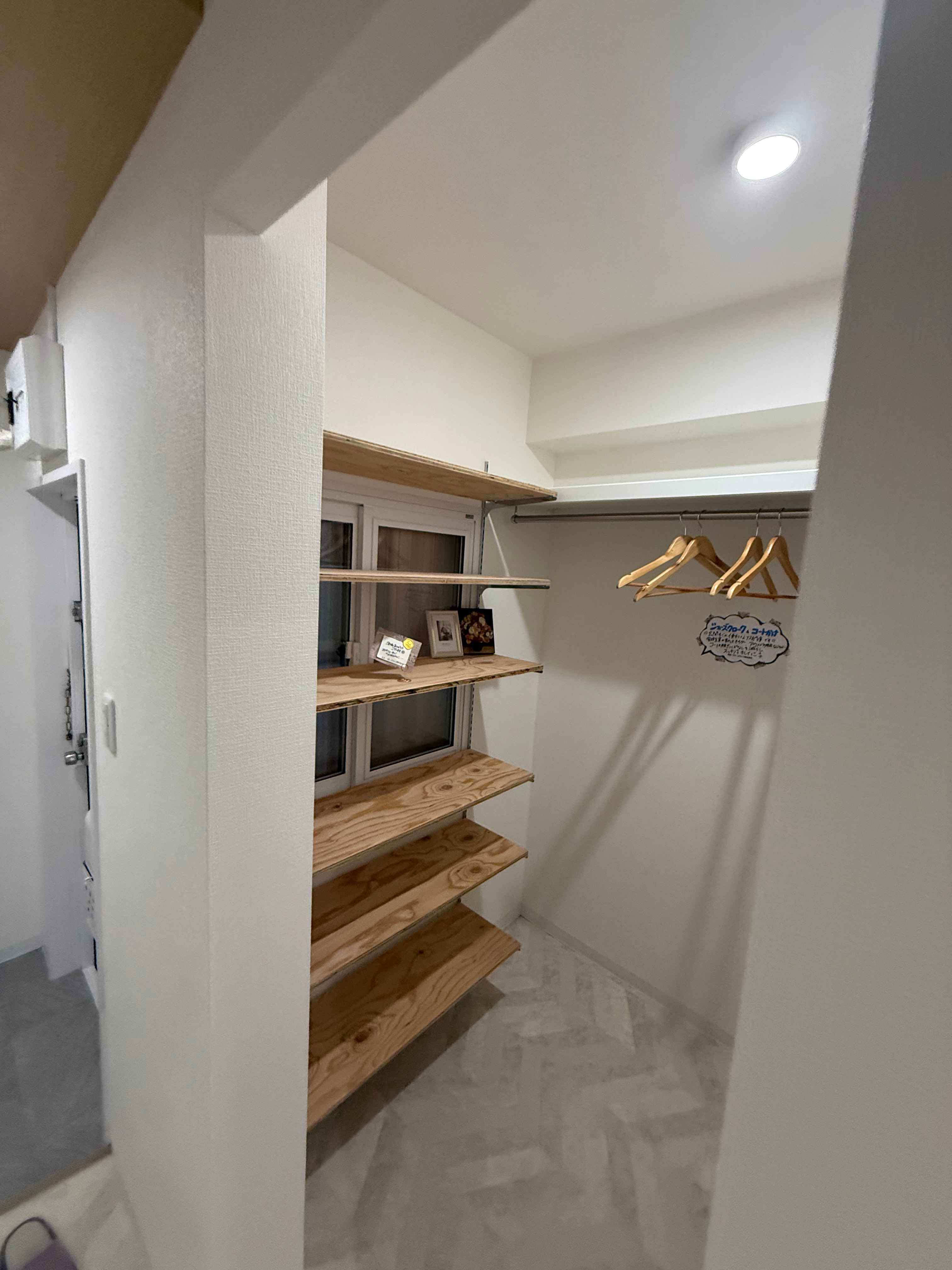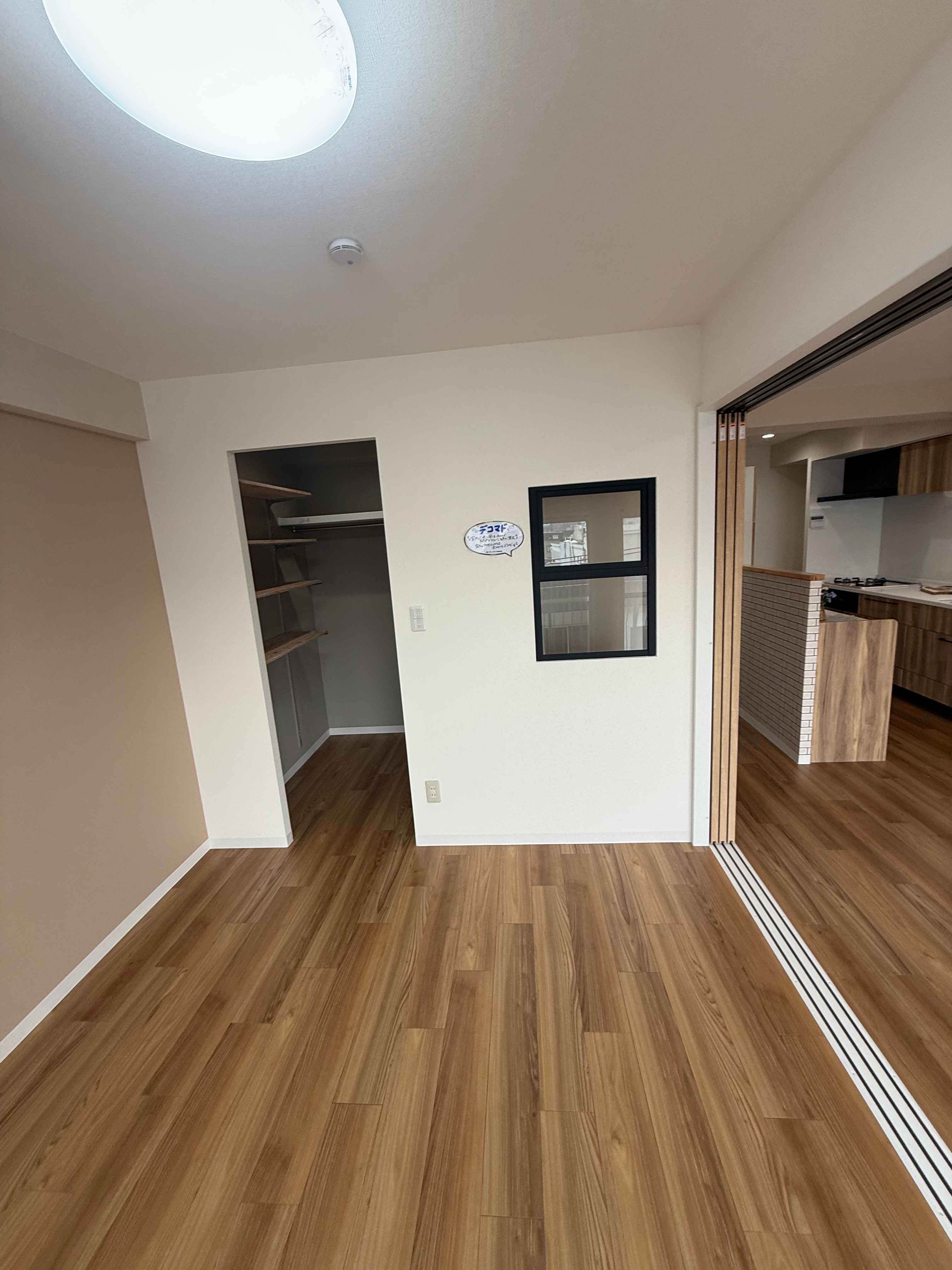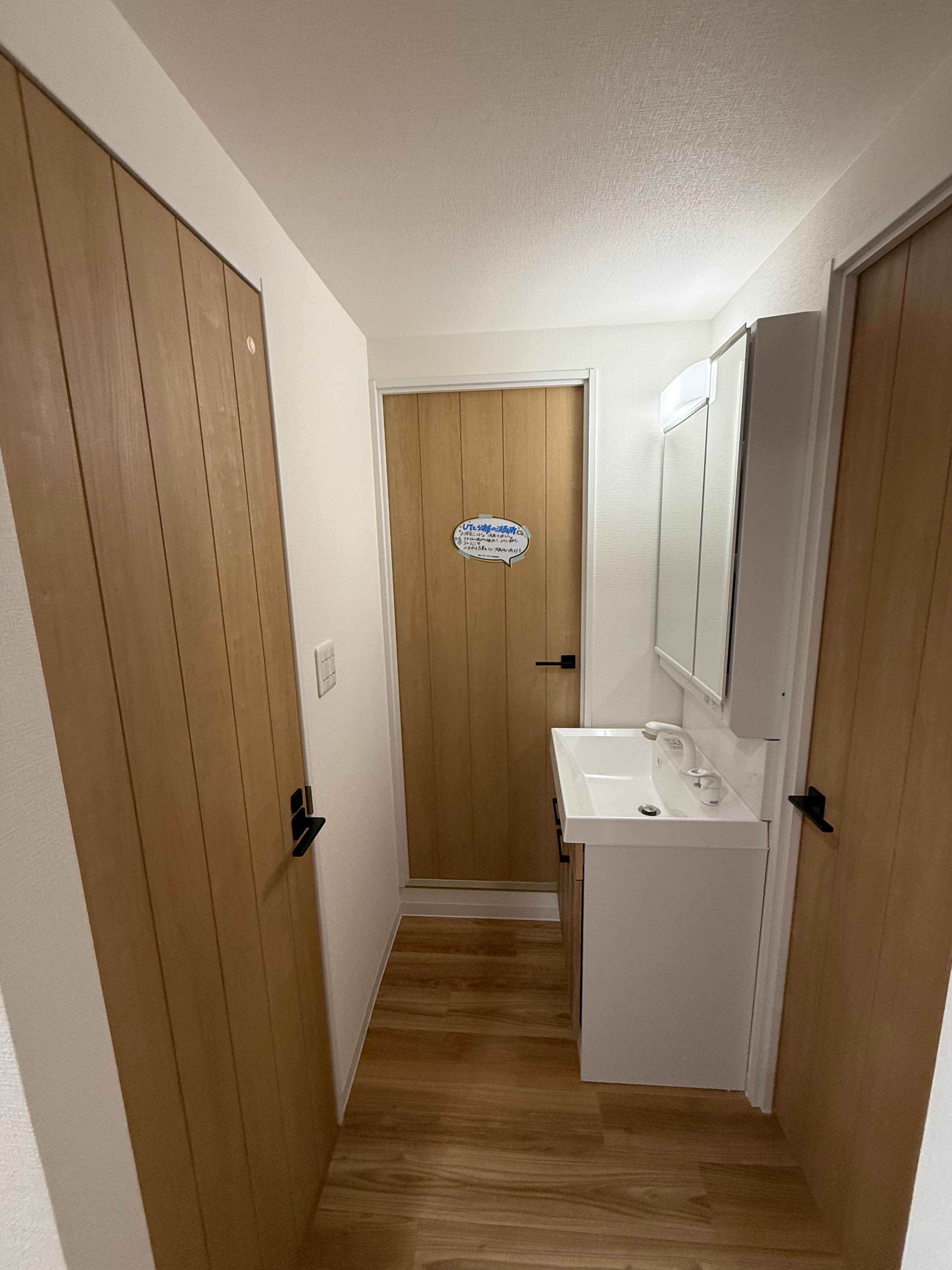 木目の床とナチュラルな建具が印象的なMS2LDK。リビング横にはワークスペースがあります。シーズクロークは大収納で、洗面と脱衣所を分離することでプライバシーのある住宅になっています。